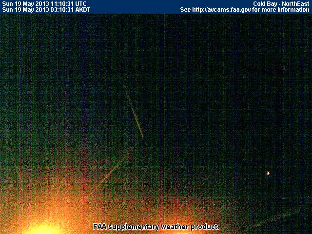 | Az első felvétel a kitörésben lévő vulkánról A képen egy kisebb gőzfelhőt láthatunk a hegy csúcsánál, melyet a lávafolyás hoz létre Forrás: AVO |